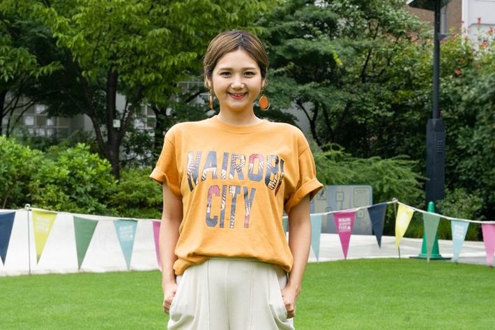 2020年7月ごろ、一時帰国中の河野リエさん。着用しているTシャツの売り上げの一部を、コロナ禍の影響で困っているケニアのテーラーや職人に寄付した 写真=河野リエさん提供