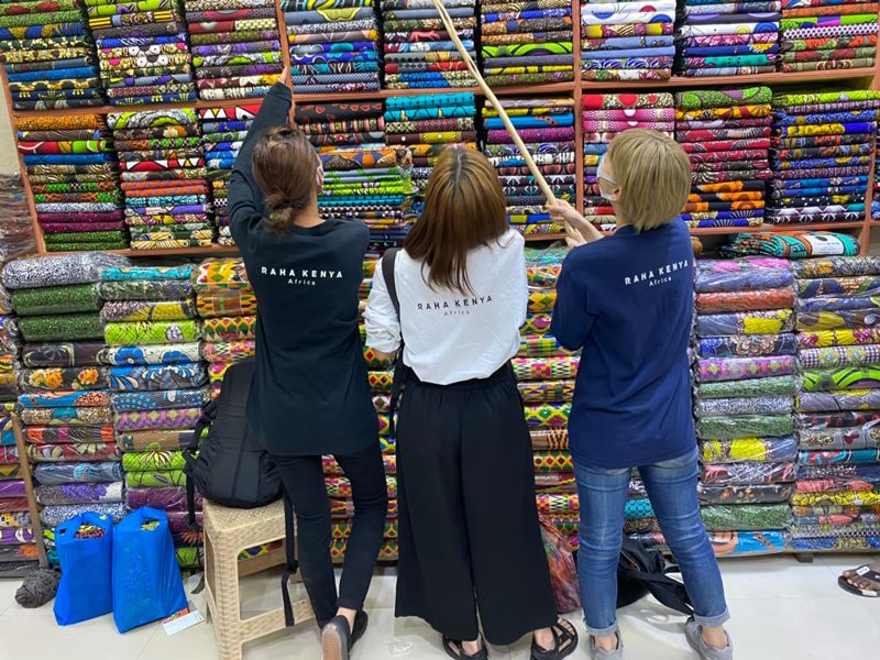 3人でナイロビの布地店で布選び 写真=河野リエさん提供