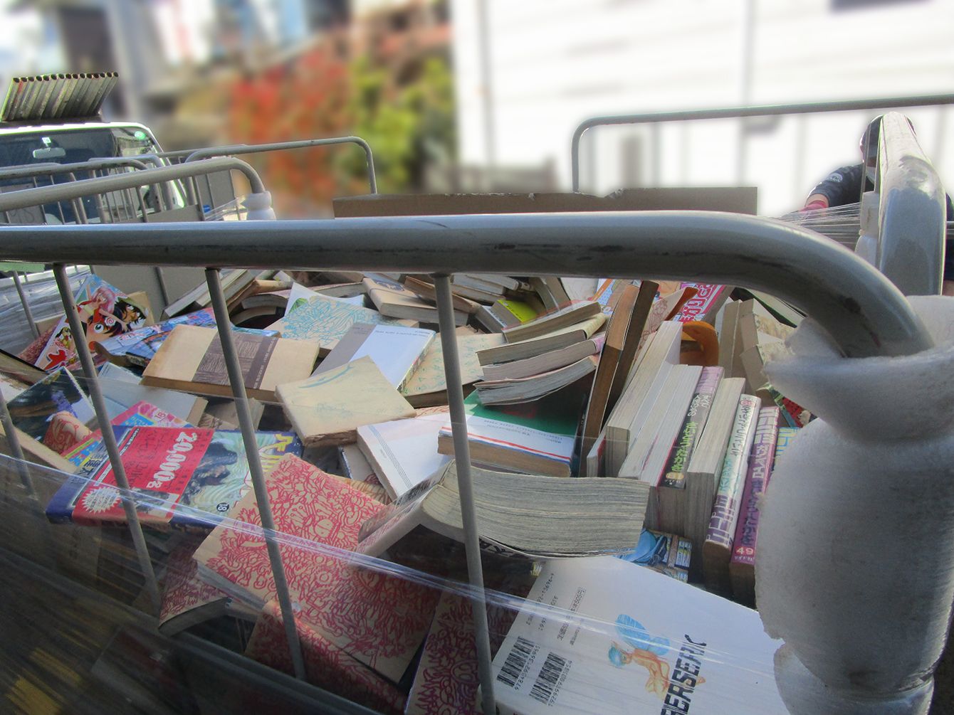 青いコンテナを使って本を運び出す。(撮影=笹井恵里子)