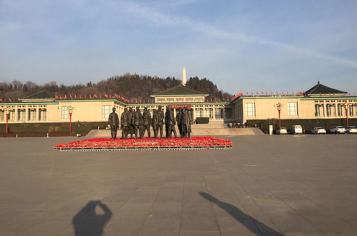 東洋風の八路軍太行記念館。屋根一面にびっしりと赤旗が立ち並ぶ