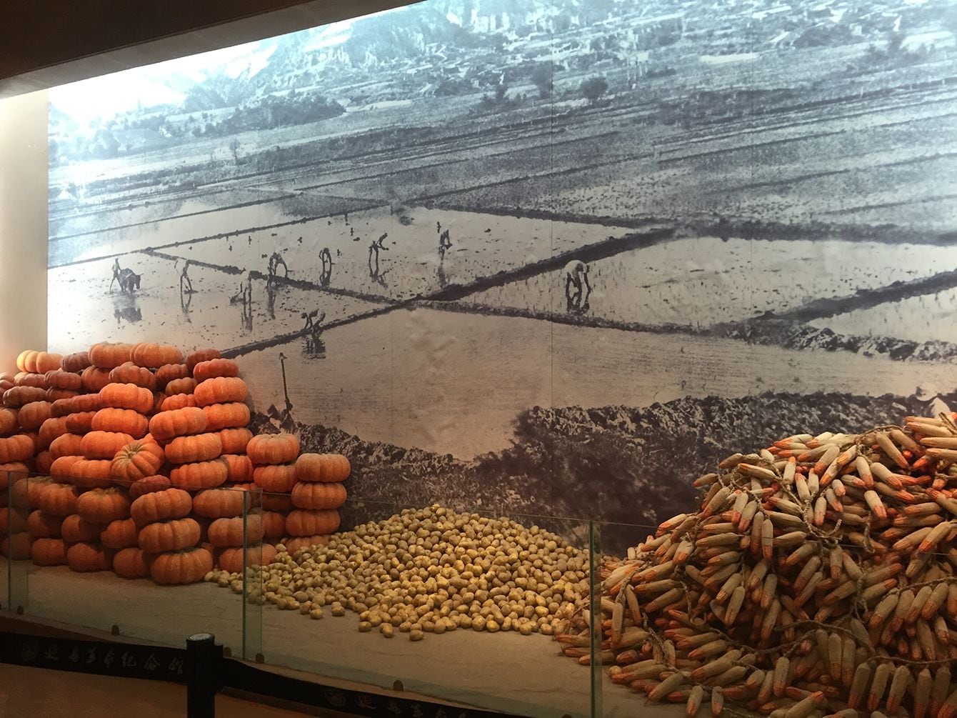 山積みされた、カボチャとジャガイモとトウモコロシの模型。明らかにスペースの無駄づかいである
