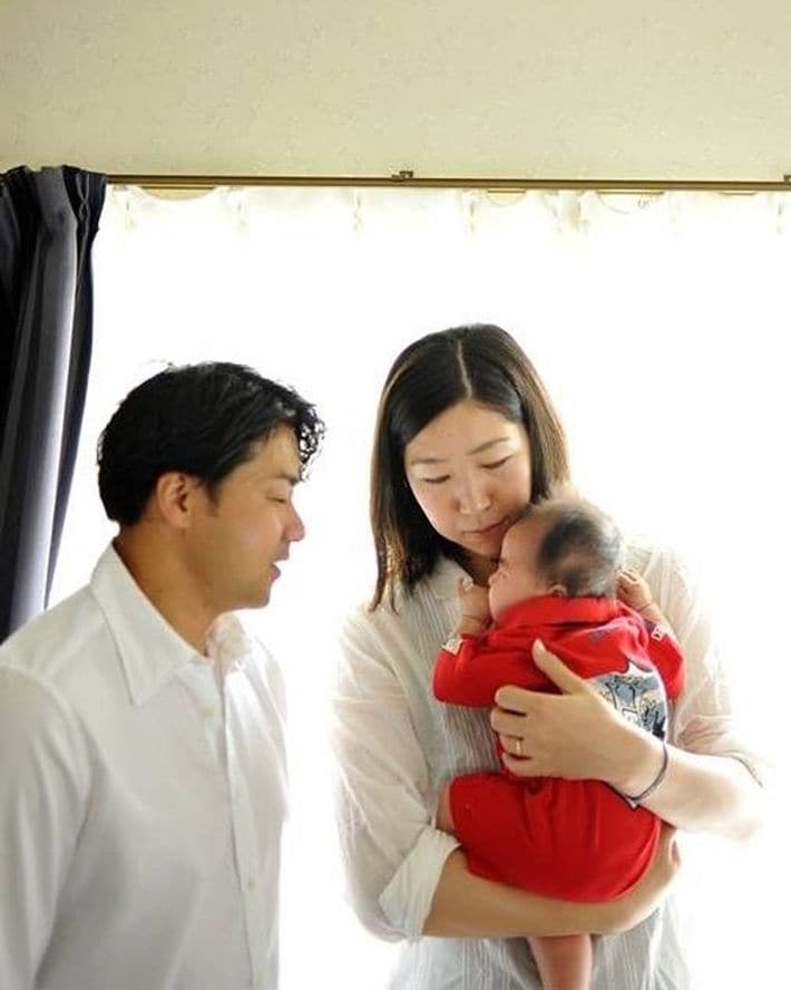 夫・四宮洋平さん(左)と、娘・和香ちゃんを抱く荒木絵里香さん(右) 写真=本人提供