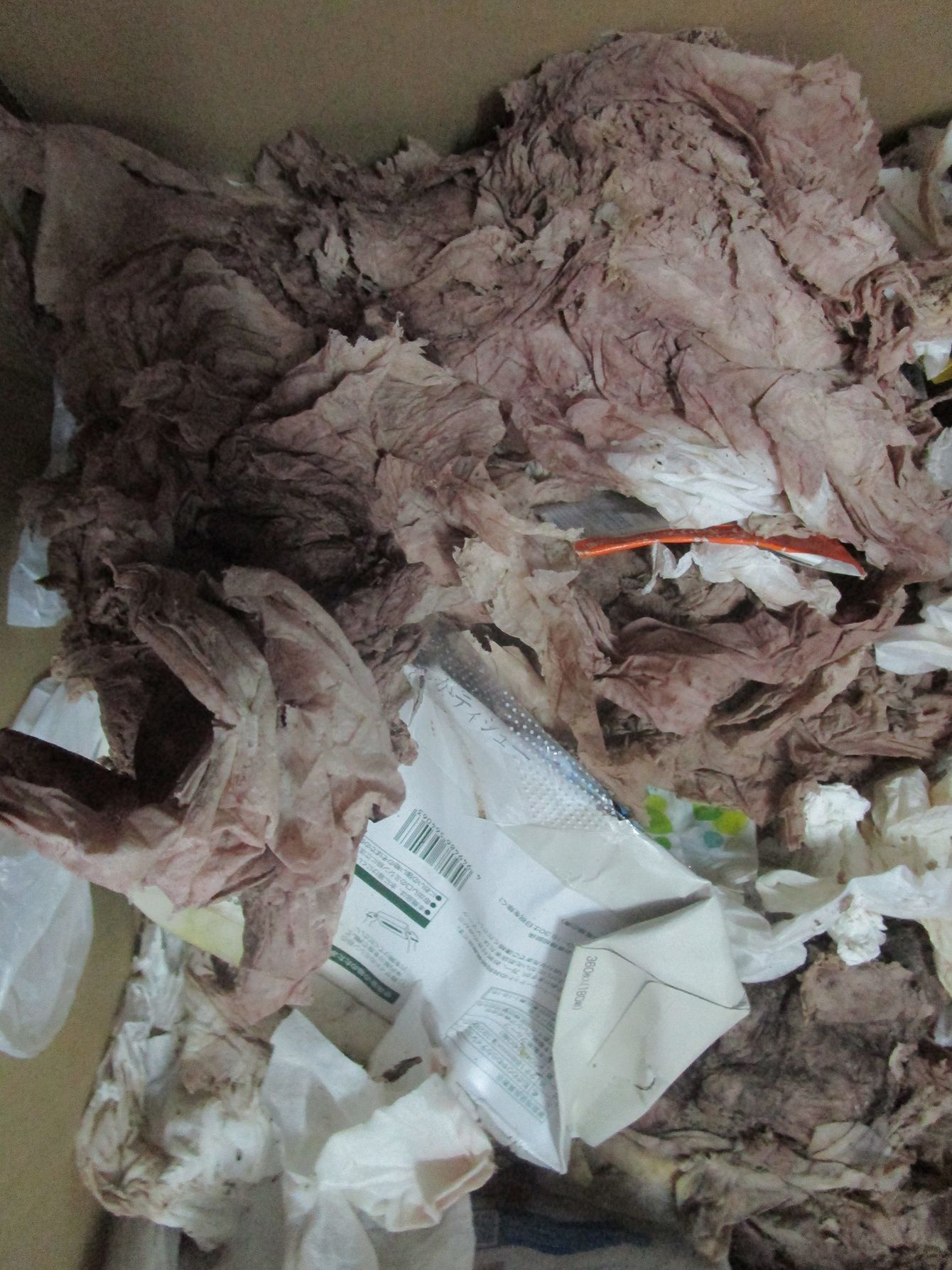 紫色になったティッシュペーパーのゴミ。尿が染みこんでいると思われる。