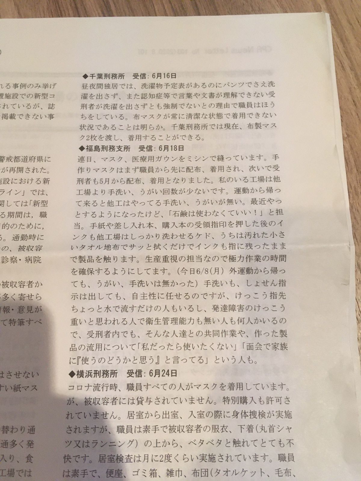 田中さんが監獄人権センターの会報誌へ投書した苦言の手紙。「私のいる工場は他工場より手洗い、うがい回数が少ないです」