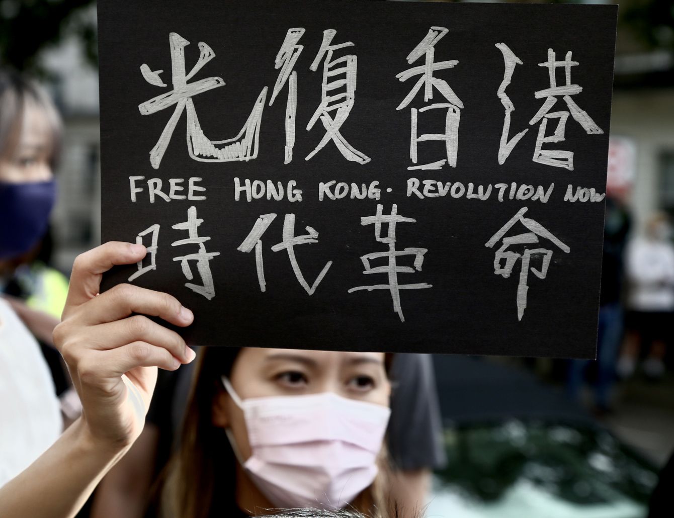 中国共産党100周年記念式典を受け、イギリス・ロンドンの中国大使館前で抗議活動を行う香港市民ら=2021年7月1日