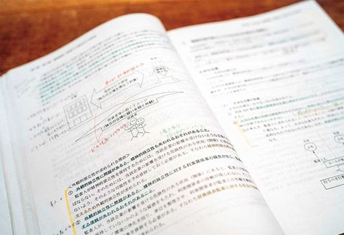 黄色い線は直前期に見返すところ、赤い書き込みは毎回間違えるところなど、ノートは使わず予備校の教科書に色分けして書き込みをする形で勉強した。