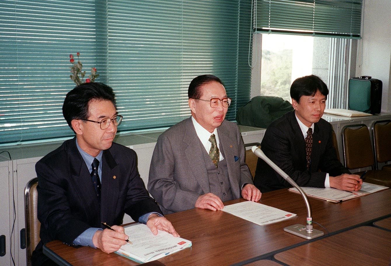 1999年1月21日、株式公開について記者会見する日本マクドナルドの藤田田社長(中央)(東京・丸の内の東商記者クラブ)