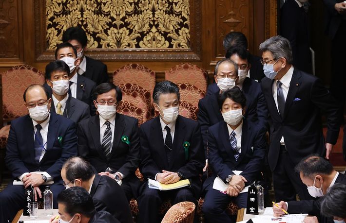 参院予算委員会に臨む武田良太総務相(右端)と、(左から)総務省の谷脇康彦前総務審議官、吉田真人総務審議官、秋本芳徳前情報流通行政局長、湯本博信前官房審議官=2021年3月11日、国会内