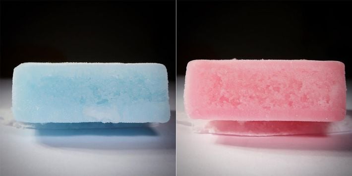 ガリガリ君の断面図(左)ソーダ(右)40周年記念フレーバーうめ