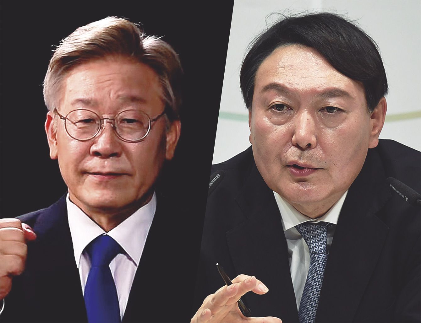 韓国大統領選挙で有力候補者の李在明(左)と尹錫悦。