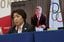 東京五輪・パラリンピックに向けた5者協議で国際オリンピック委員会(IOC)のトーマス・バッハ会長(後方モニター)のあいさつを聞く大会組織委員会の橋本聖子会長=2021年3月3日、東京都中央区