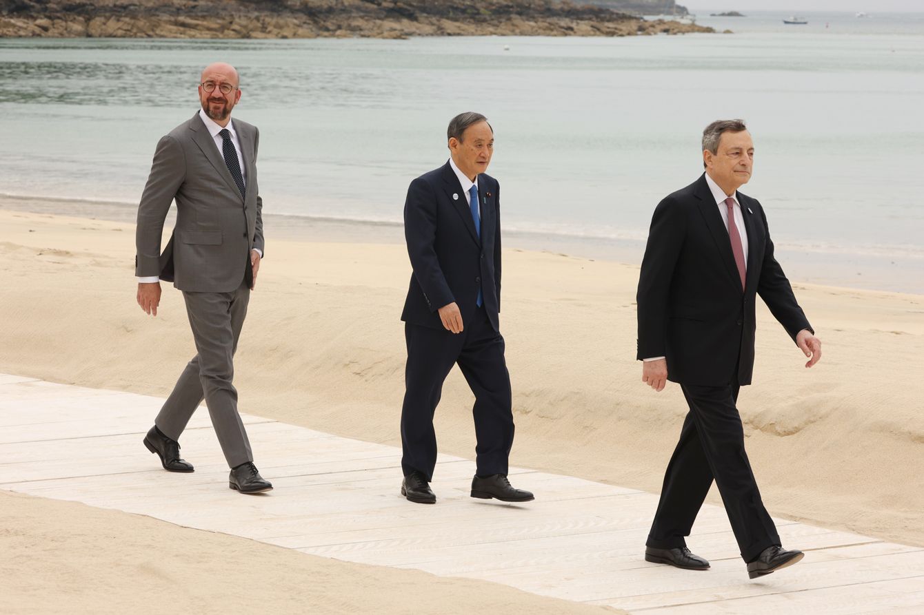 G7サミットで記念撮影に臨む菅義偉首相(中央)。右はドラギ伊首相、左はミッシェルEU大統領=2021年6月11日、イギリス・コーンウォール