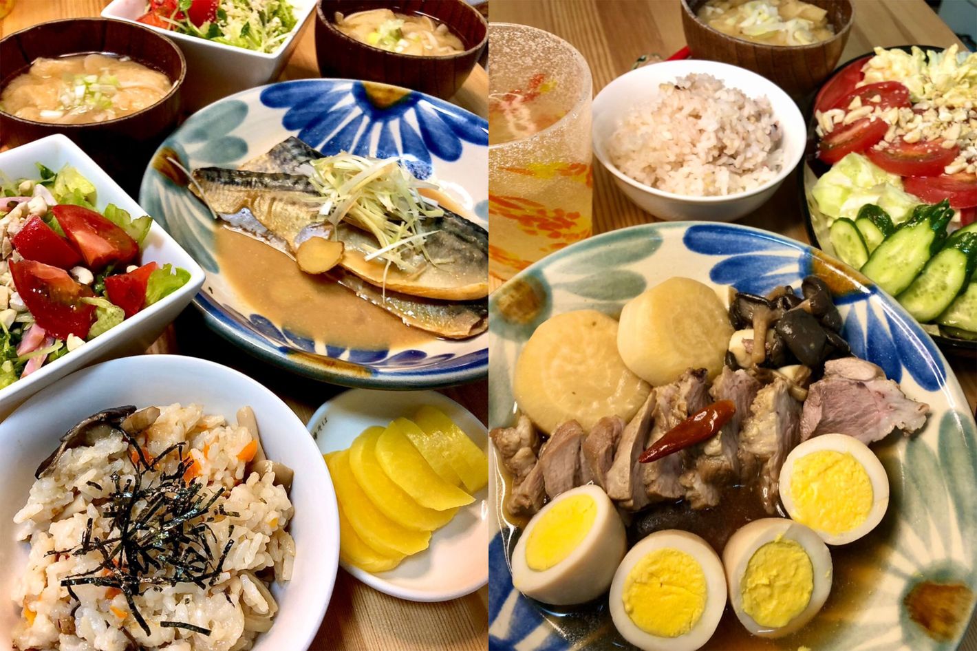 (左)サバの味噌煮と炊き込みご飯。魚より肉派の彼女にも美味しく食べてもらえるよう色々工夫しています。(右)豚の煮物です。煮物は時間がかかって忙しい人にはハードルが高いのでヒモ(暇人)が真っ先に覚えるべき料理です。