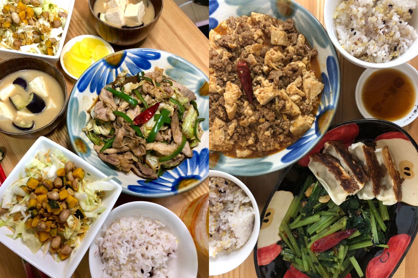 (左)回鍋肉とナス豆腐味噌汁と無限キャベツ。キャベツ三昧なこのメニューは彼女からのリクエストです。(右)今の彼女の好みに合わせ、辛くない甘口麻婆豆腐です。お互いにとって居心地の良い関係を二人で模索しています。
