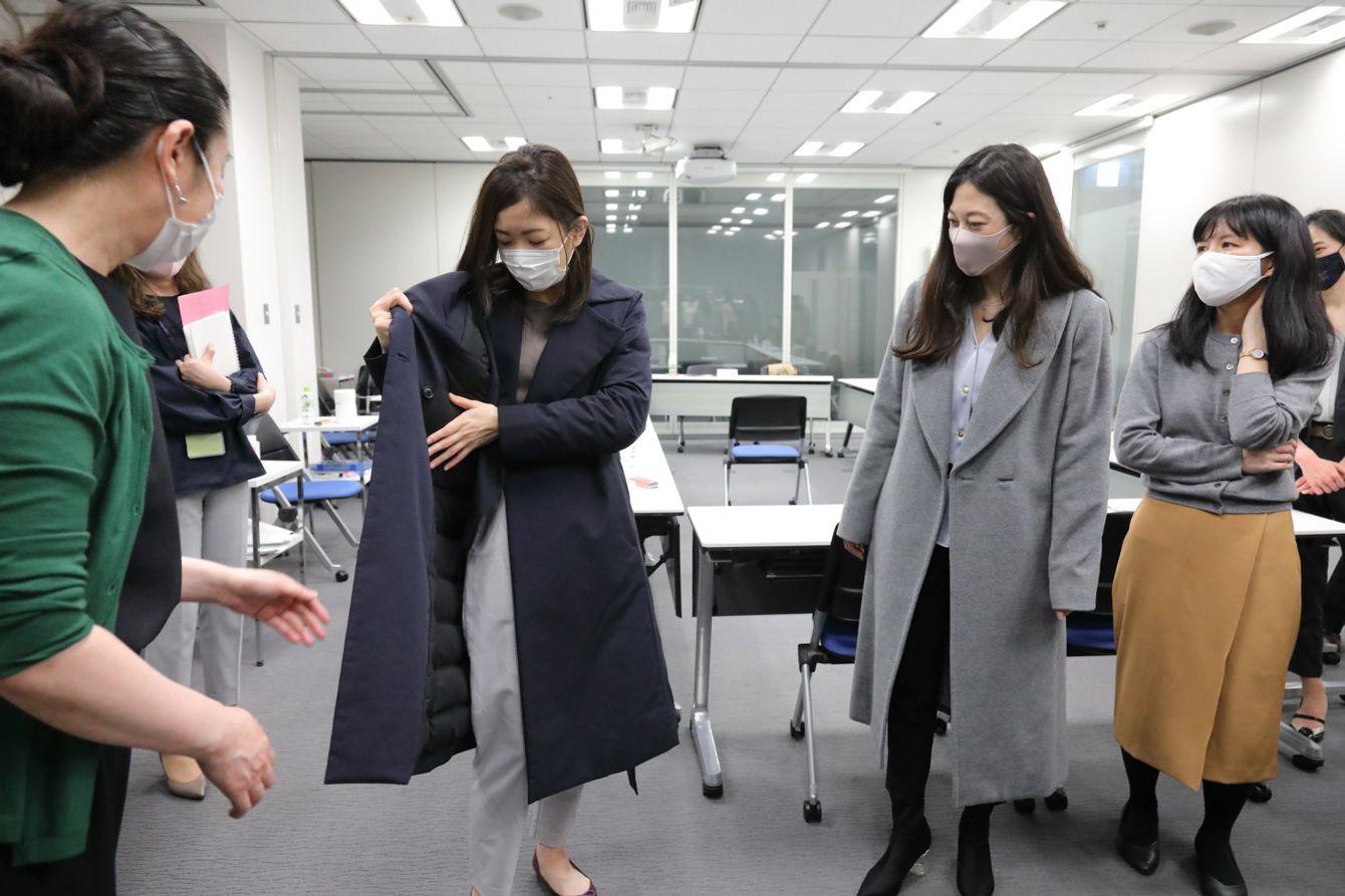 座談会ではさまざまなダウンコートのサンプルを試着してもらいながら本音を引き出した。