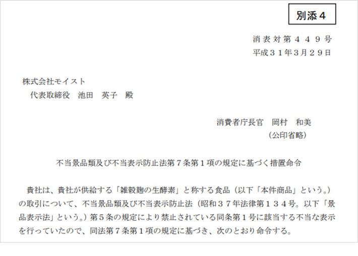 消費者庁から「雑穀麹の生酵素」販売元の株式会社モイストへの命令(一部抜粋)