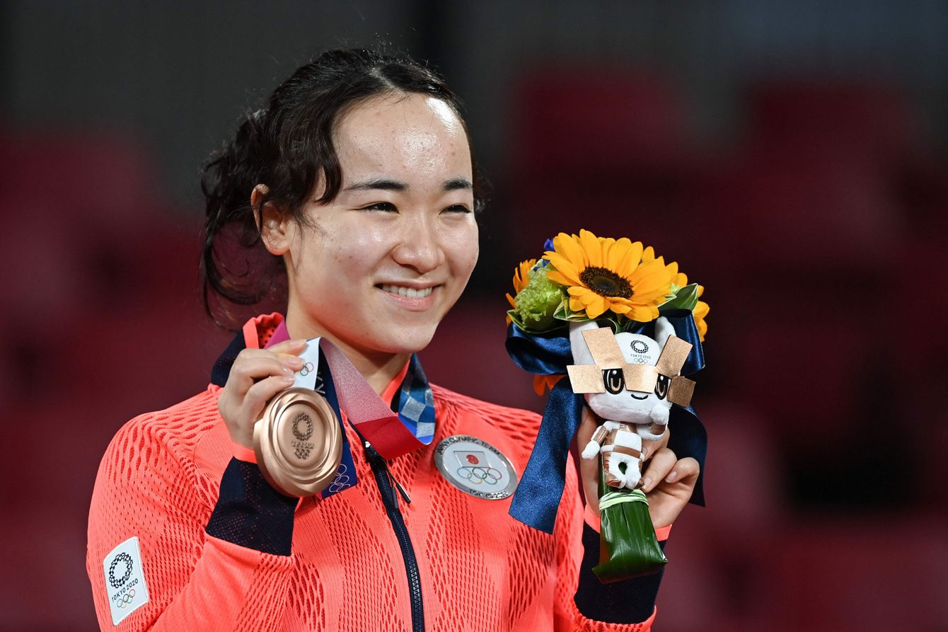 2021年7月29日、東京2020オリンピックの東京体育館で行われた卓球女子シングルスのメダル授与式で、獲得した銅メダルを手にポーズをとる伊藤美誠選手(20)=スターツ。