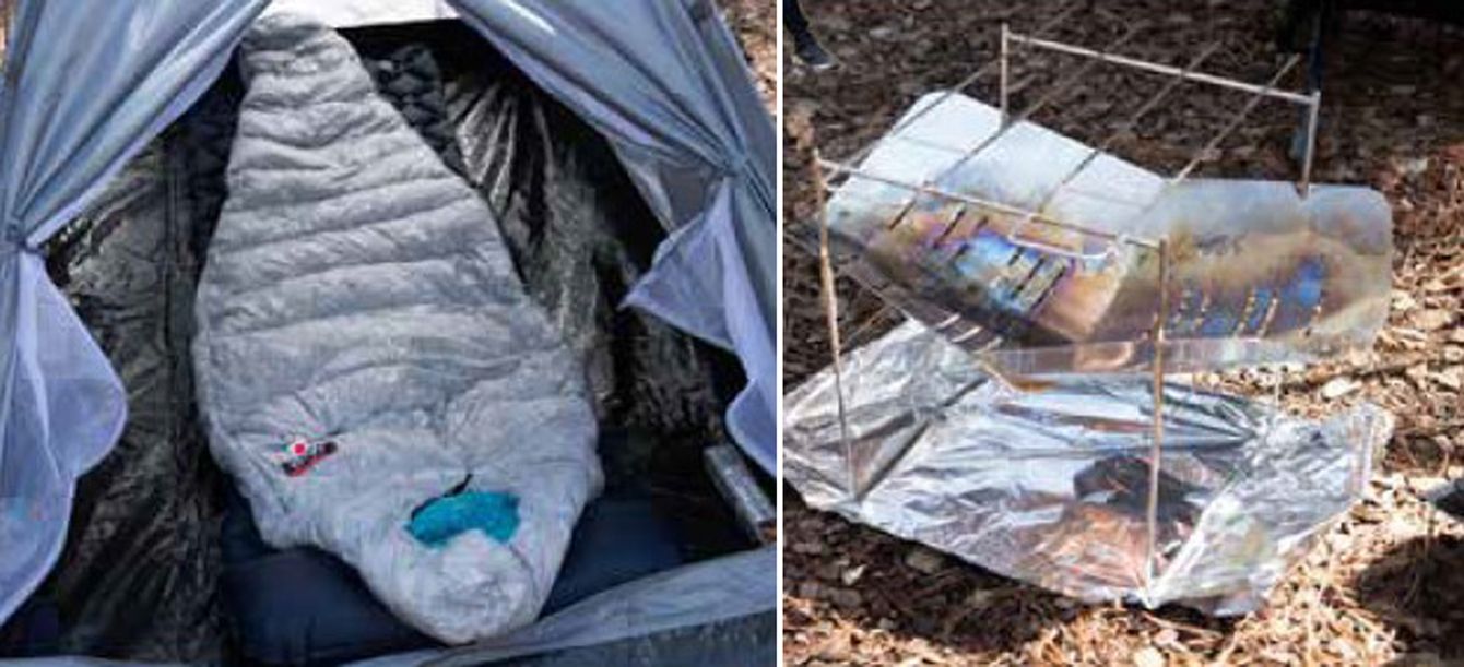 (写真左)寝袋、(写真右)ピコグリル