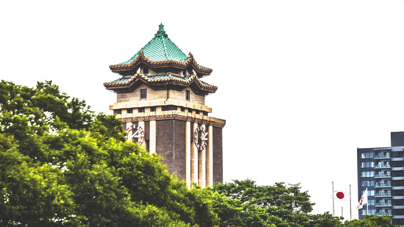 名古屋市役所本庁舎。二層の屋根を配した塔の頂上には、しゃちを載せ、名古屋城との調和を図ったという。