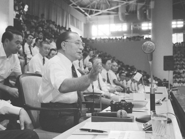 講演する創価学会の池田大作名誉会長(1986年8月31日、東京・八王子市の創価大学)