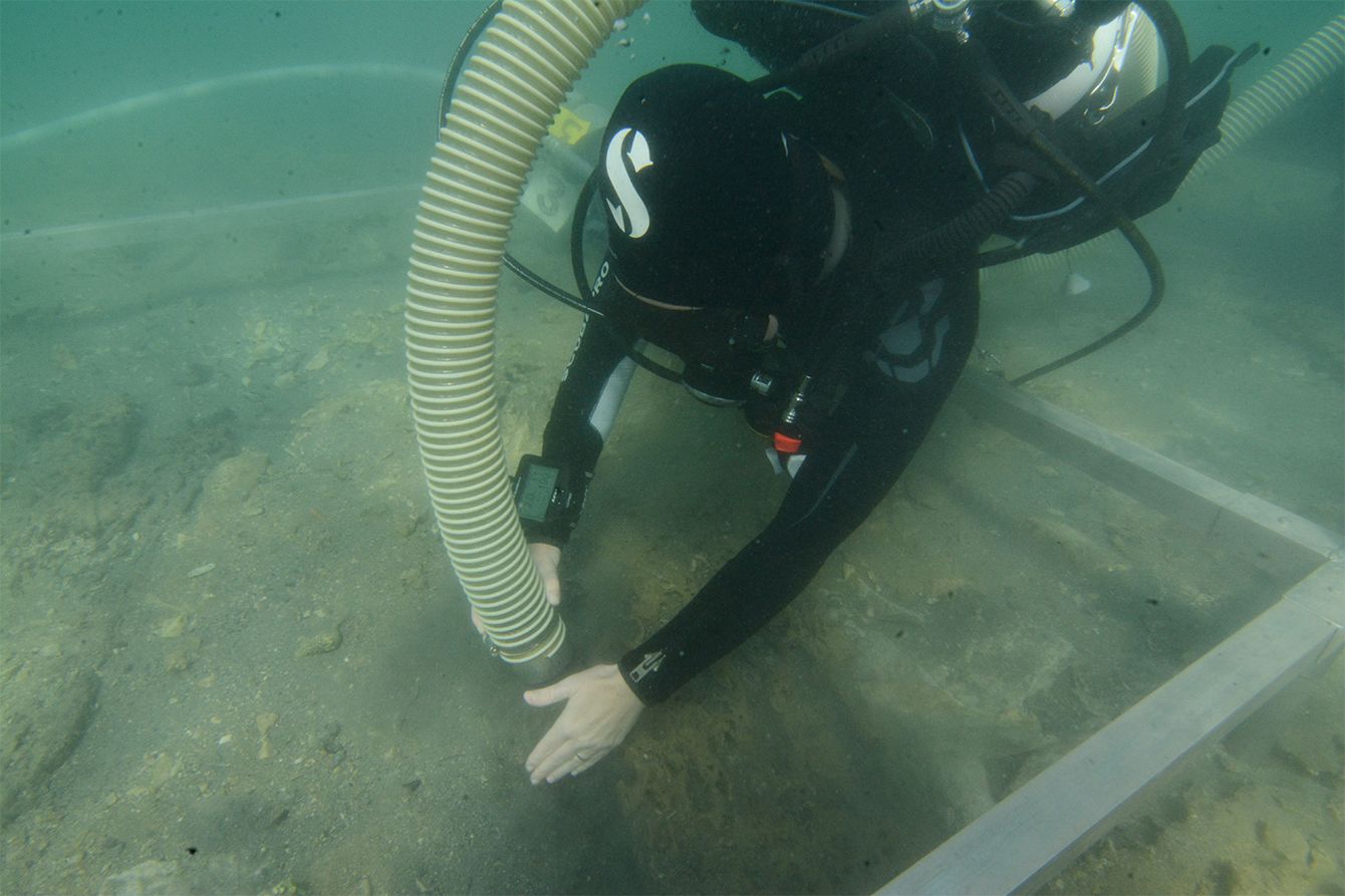 ドレッジという器具を使った水中発掘の様子
