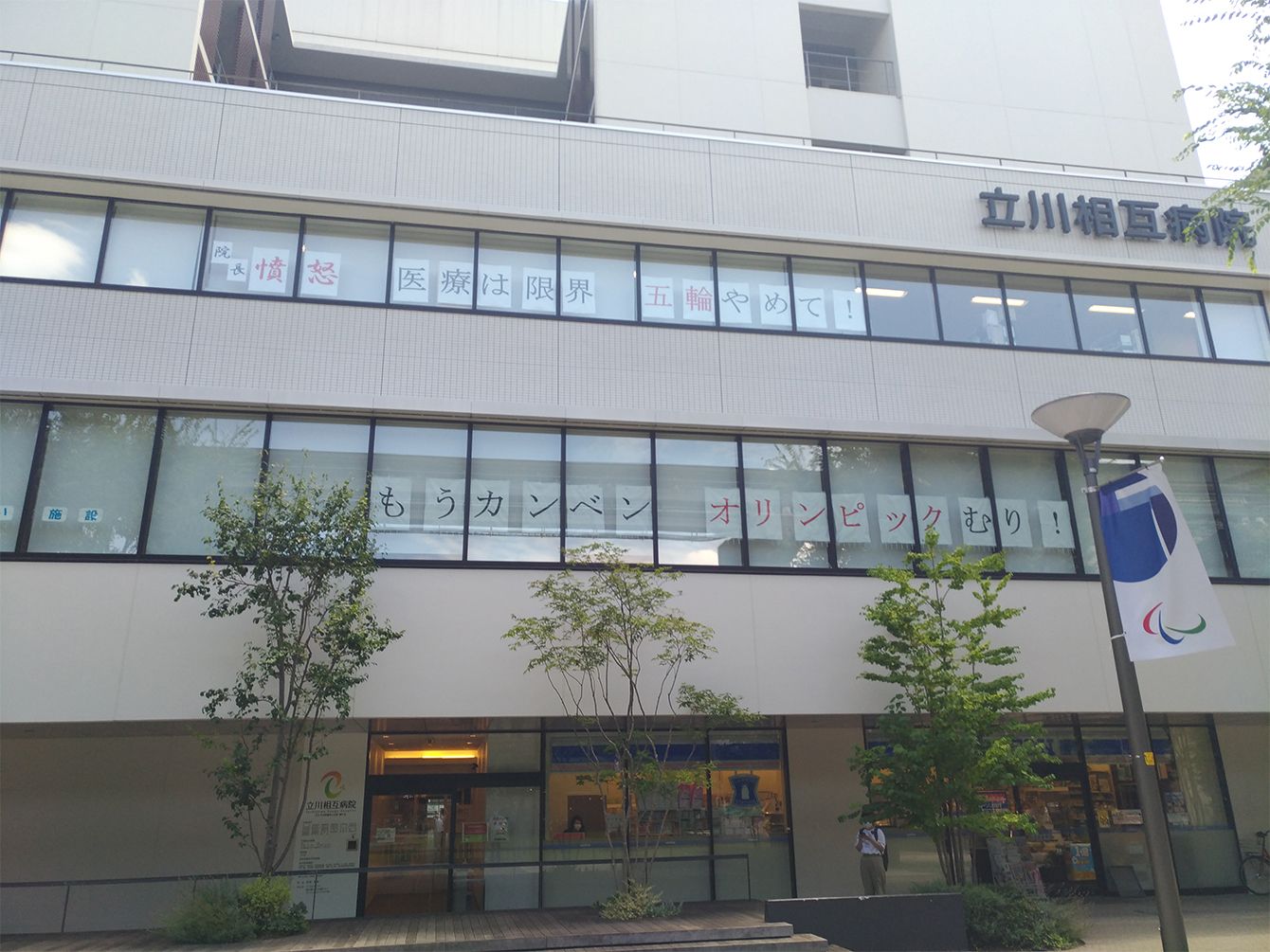 「五輪やめて」「もうカンベン」などのメッセージが張り出された立川相互病院