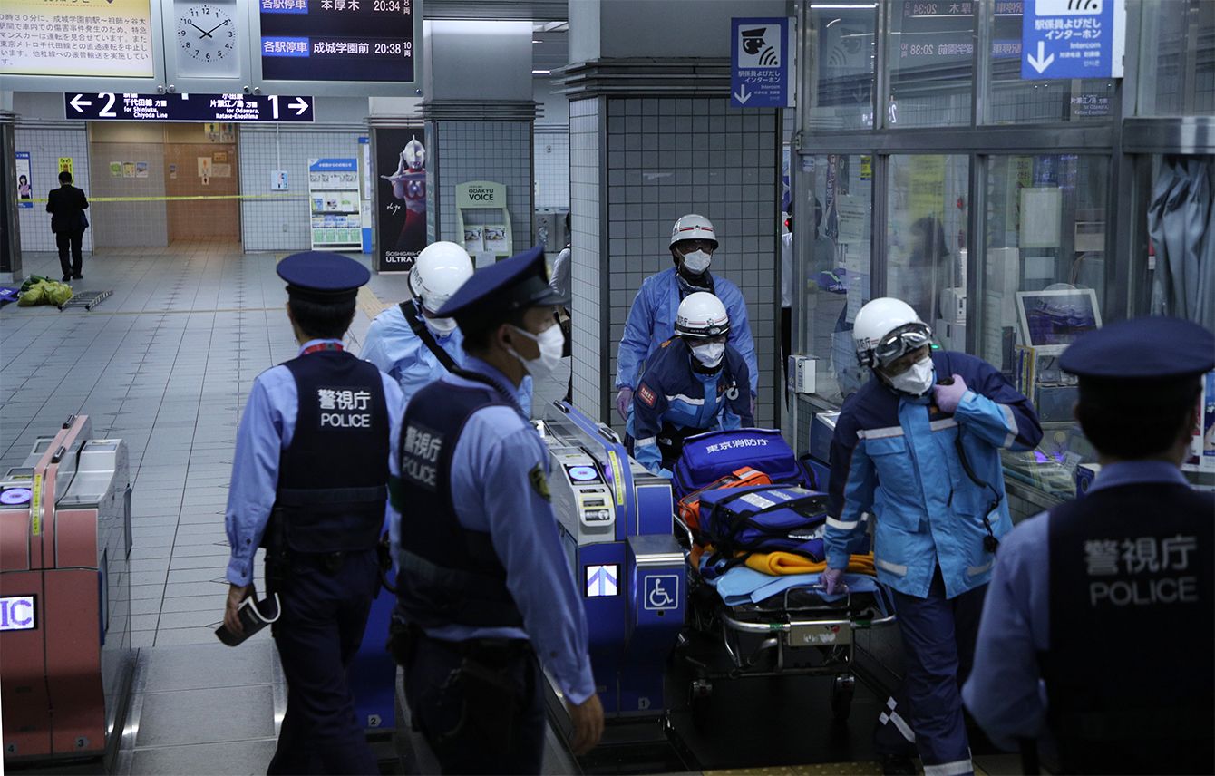 小田急線の祖師ケ谷大蔵駅に駆け付けた救急隊員ら=2021年8月6日夜、東京都世田谷区
