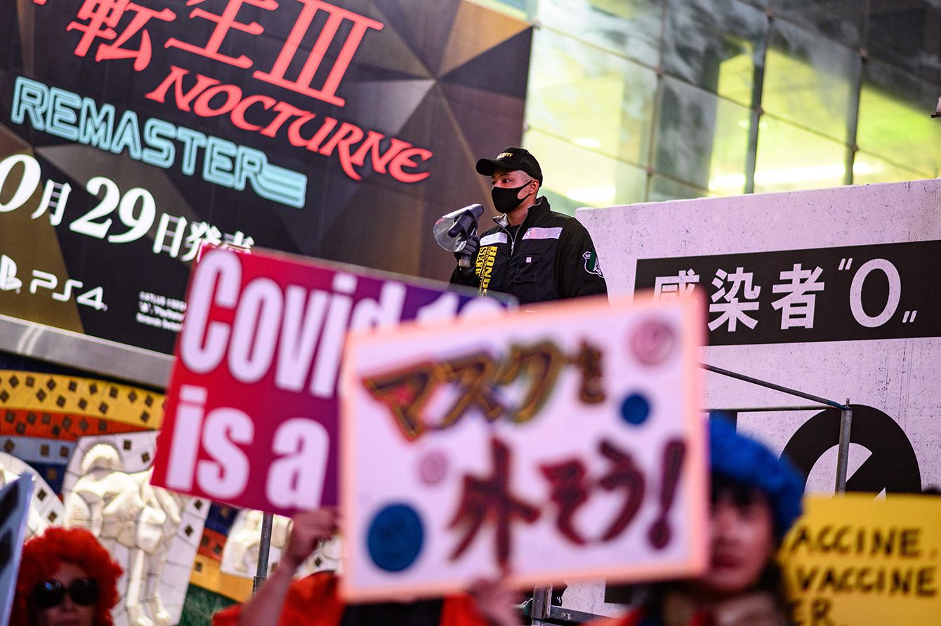 新型コロナウイルスの感染症対策などに抗議し、デモをする人たち=2020年10月31日