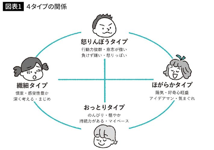 4タイプの関係(イラスト=『モンテッソーリ教育×シュタイナー教育×森のようちえんから学ぶ 子どもの「生きる力」を伸ばす方法』)