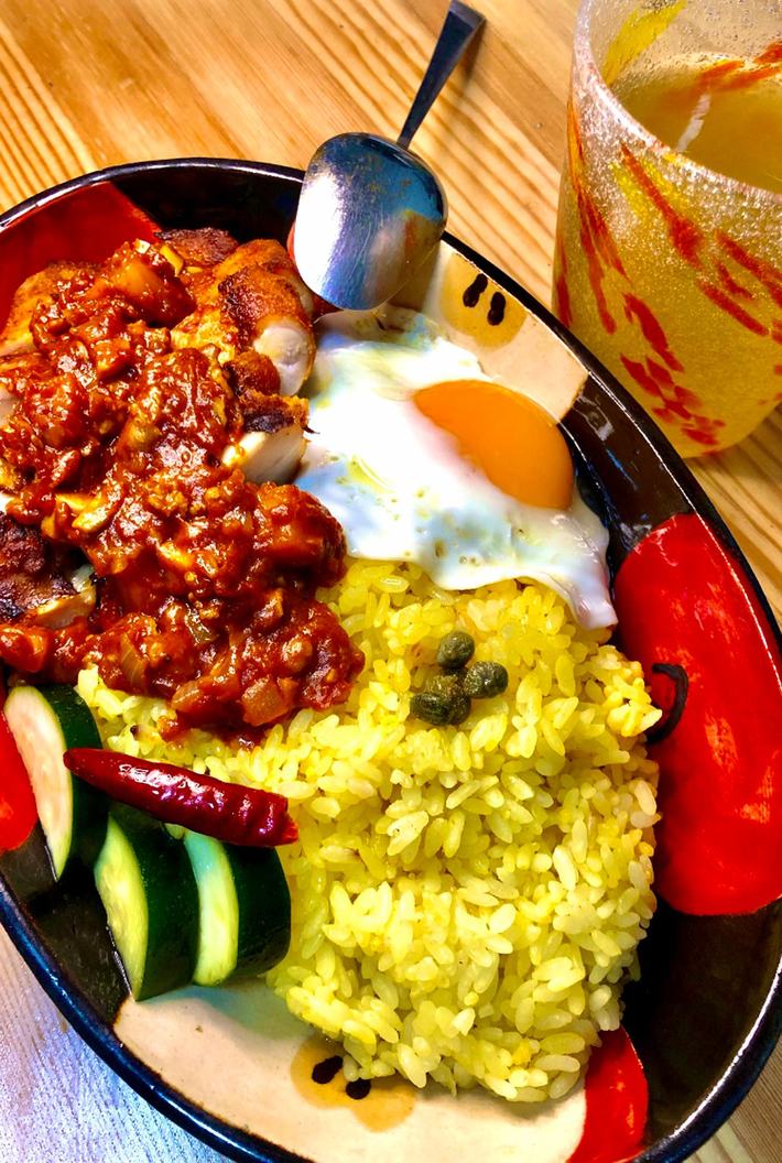 トマトカレー。付け合わせはズッキーニのオリーブオイル漬け。目玉焼きも彼女の希望。