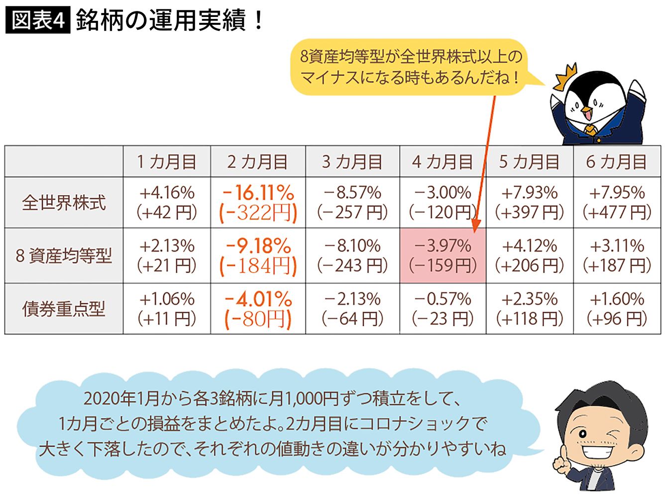 2020年1~6月までの運用実績をもとに算出。運用実績については毎月1日に、各銘柄に月1000円ずつ積立注文を行った際の損益率を掲載。