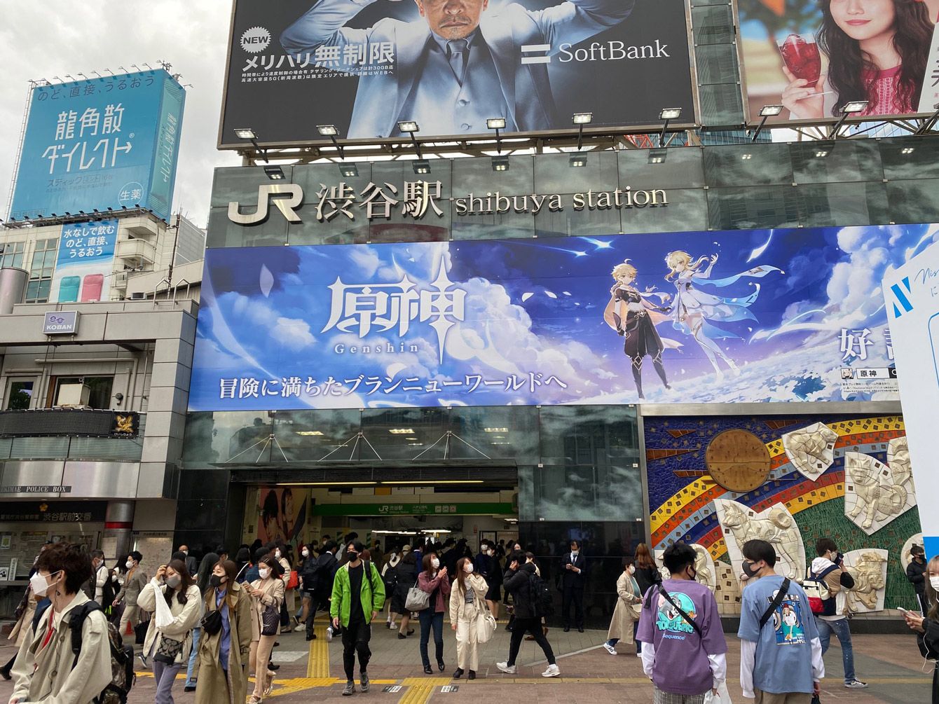東京・渋谷駅前にある「原神」の巨大広告=2021年4月6日