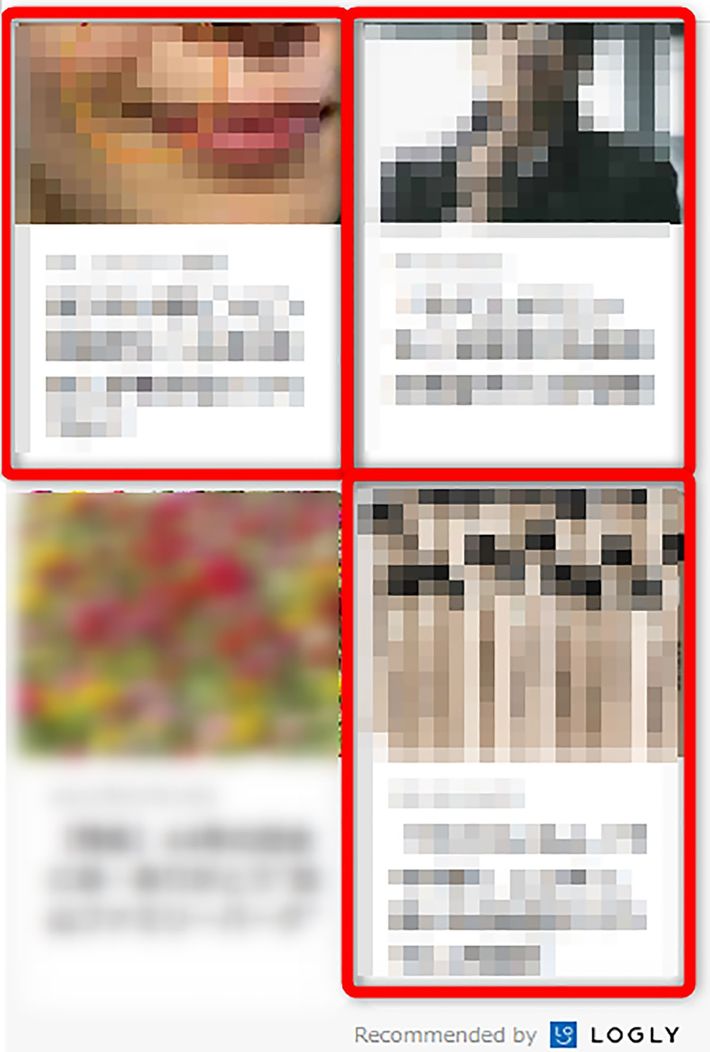 ウェブサイトに掲載されているレコメンドウィジェット広告(画像取得日付時刻:2021年7月22日22時06分 ※赤枠線とモザイクは筆者加工)