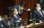 衆院本会議場で菅義偉首相(中央左)に声を掛ける安倍晋三前首相(同右)=2021年4月1日、国会内