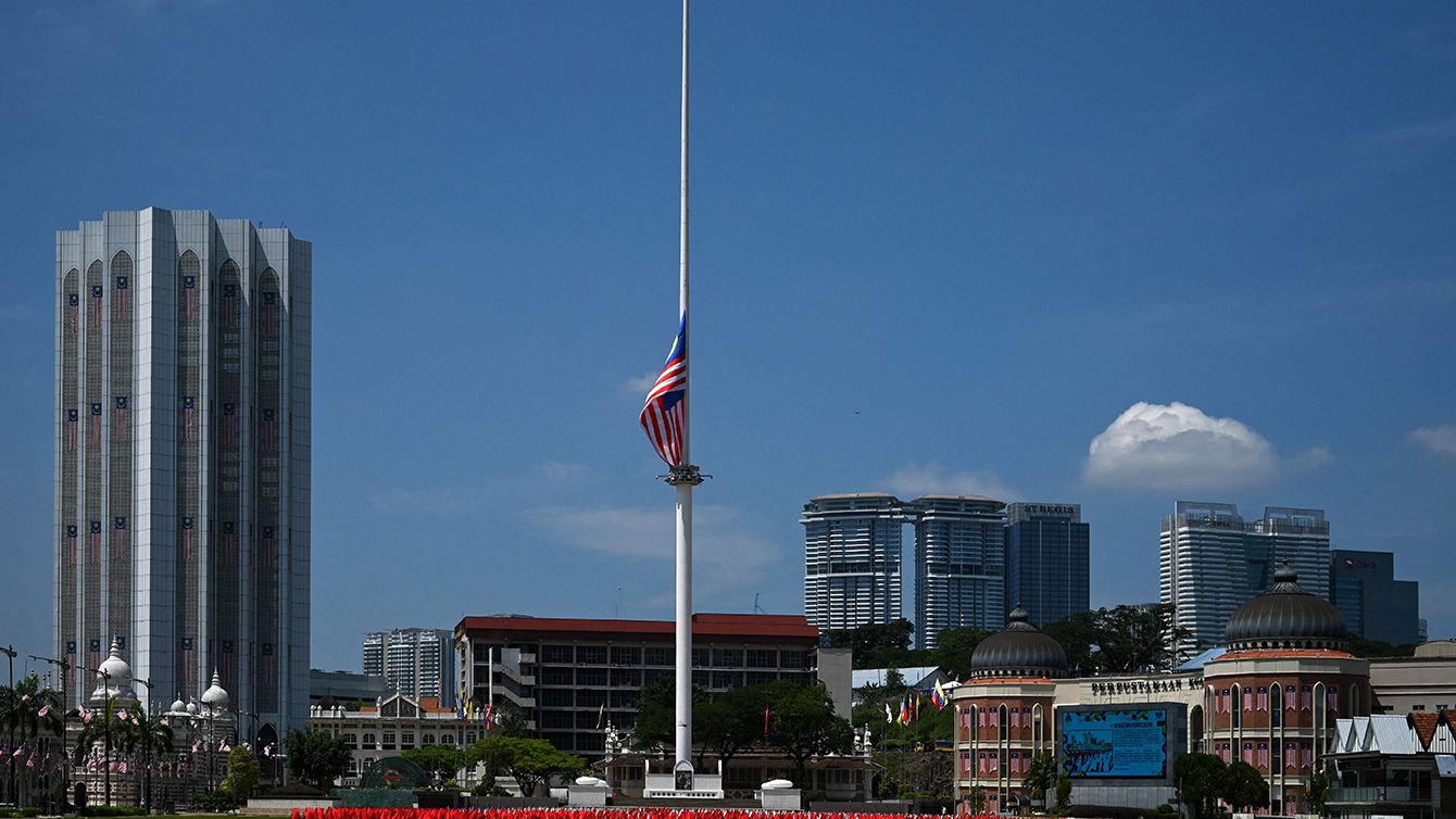 独立を記念する第64回ナショナル・デーの祝賀会に先立ち掲揚されるマレーシアの国旗=2021年8月30日、クアラルンプールのムルデカ・スクエア