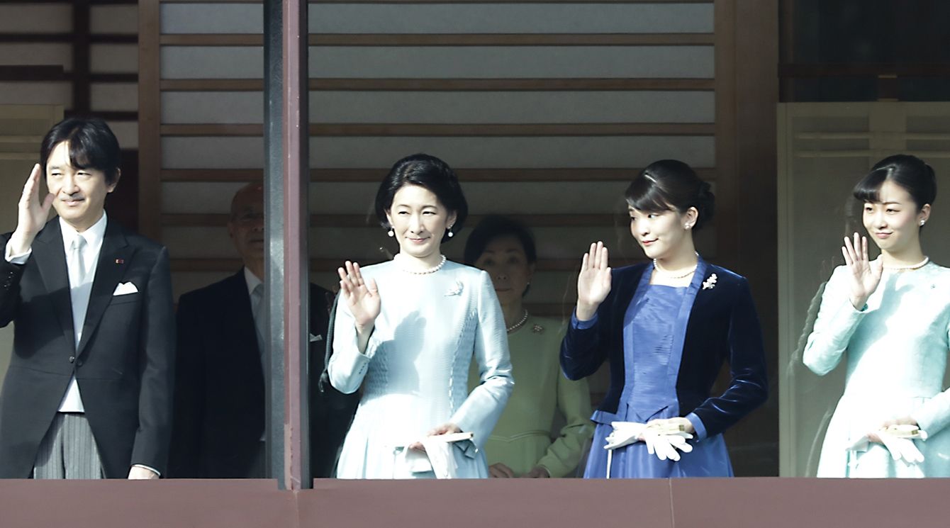 新年一般参賀で手を振られる秋篠宮ご一家=2020年1月2日、皇居・宮殿・長和殿のベランダ