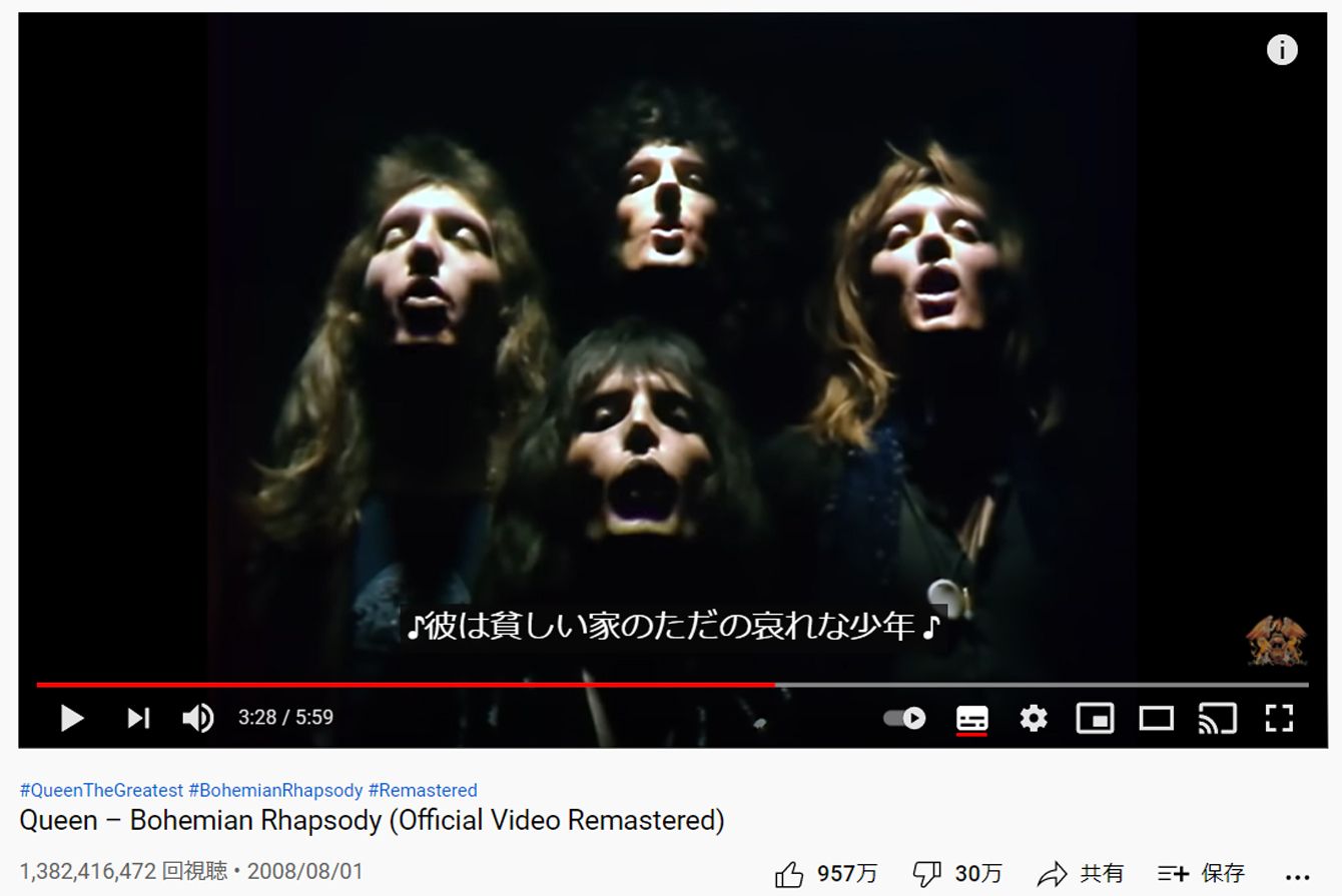 クイーン公式YouTubeの歌詞付き動画(英語と和訳の両方が掲載)(出所=