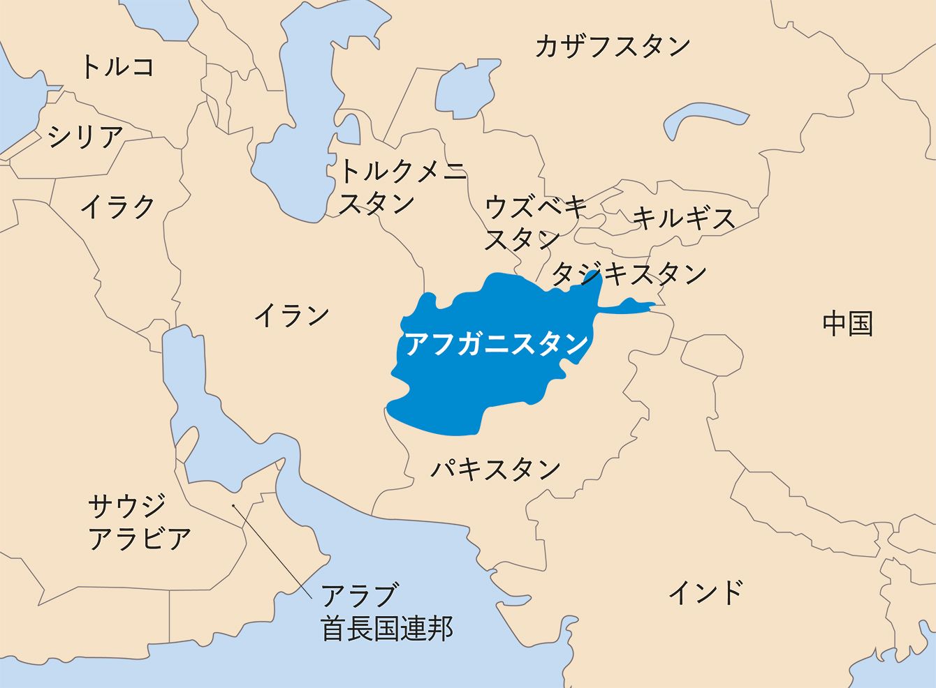 アフガニスタンおよび周辺地域の地図。