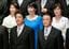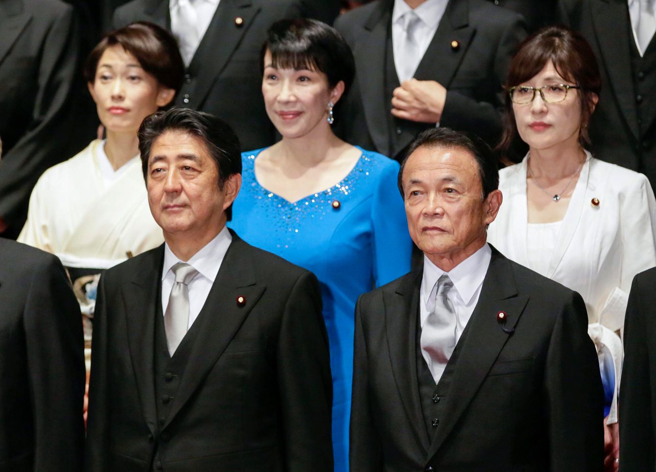 2016年8月3日、東京の首相官邸にて。安倍首相(当時)が行った内閣改造で新たに任命された稲田朋美防衛大臣(右上)、再任された高市早苗総務大臣(上中央)らと写真に納まる安倍晋三首相(左前)と麻生太郎財務大臣(右前)