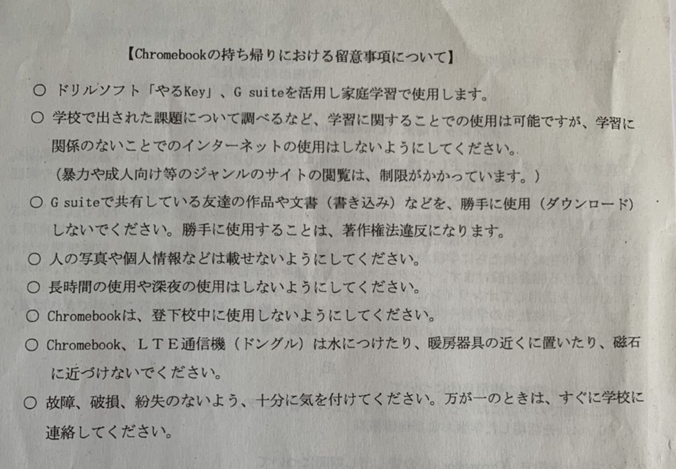クロームブックを渡す際に配布されたお便り。管理を家庭に押し付けている