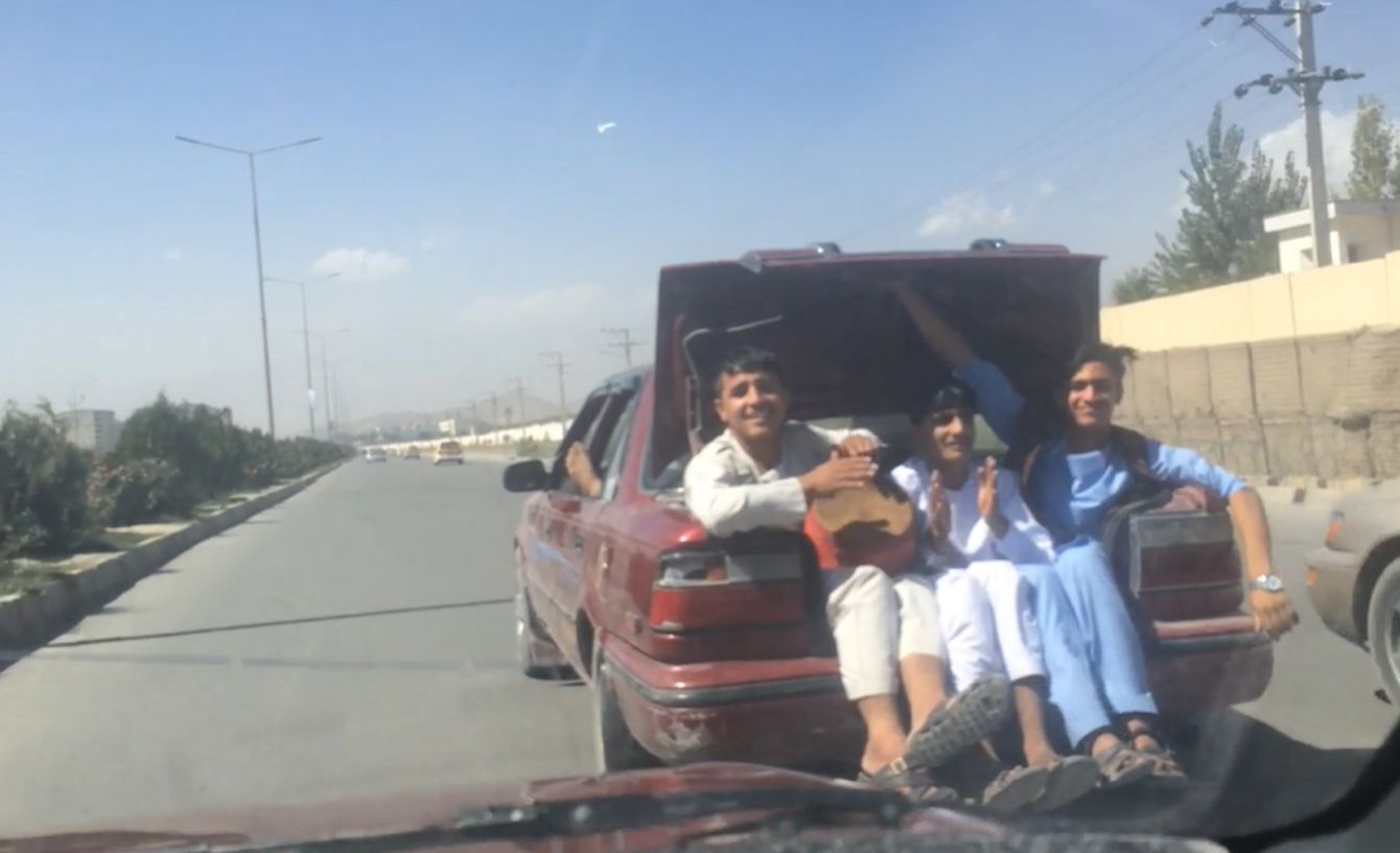 車のトランクに乗り込み音楽を楽しむ若者たち。各国の支援で新たに舗装されたカブールの道路にて。2018年、バシール氏撮影