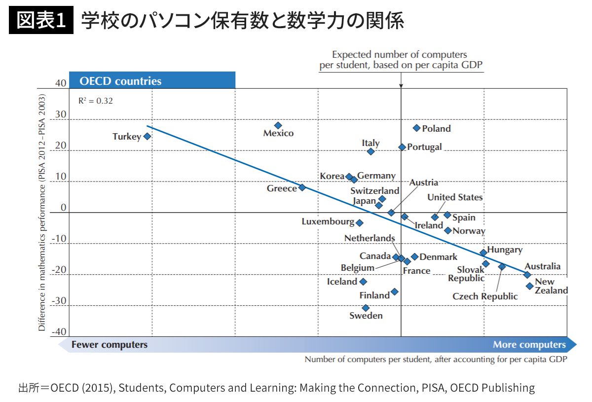 学校で生徒あたりのパソコン保有数の多い国ほど、数学の成績が悪くなる