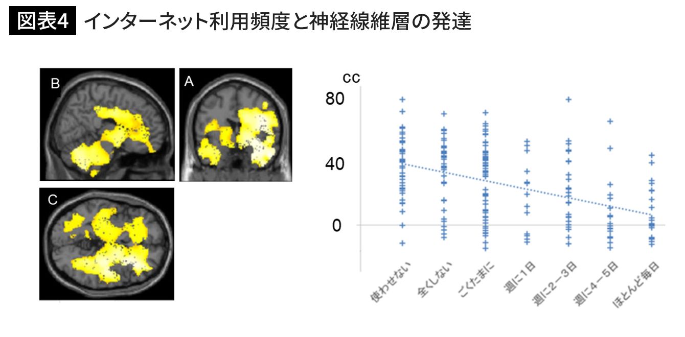 仙台市在住5~18歳、224名の3年間の脳発達をMRIで計測。インターネット習慣が多い子どもは3年後、広範な領域で神経細胞ネットワークである神経線維層の体積が増加していなかった。ちなみに最初の時点で、インターネット習慣が多いものほど脳が小さいわけではない。