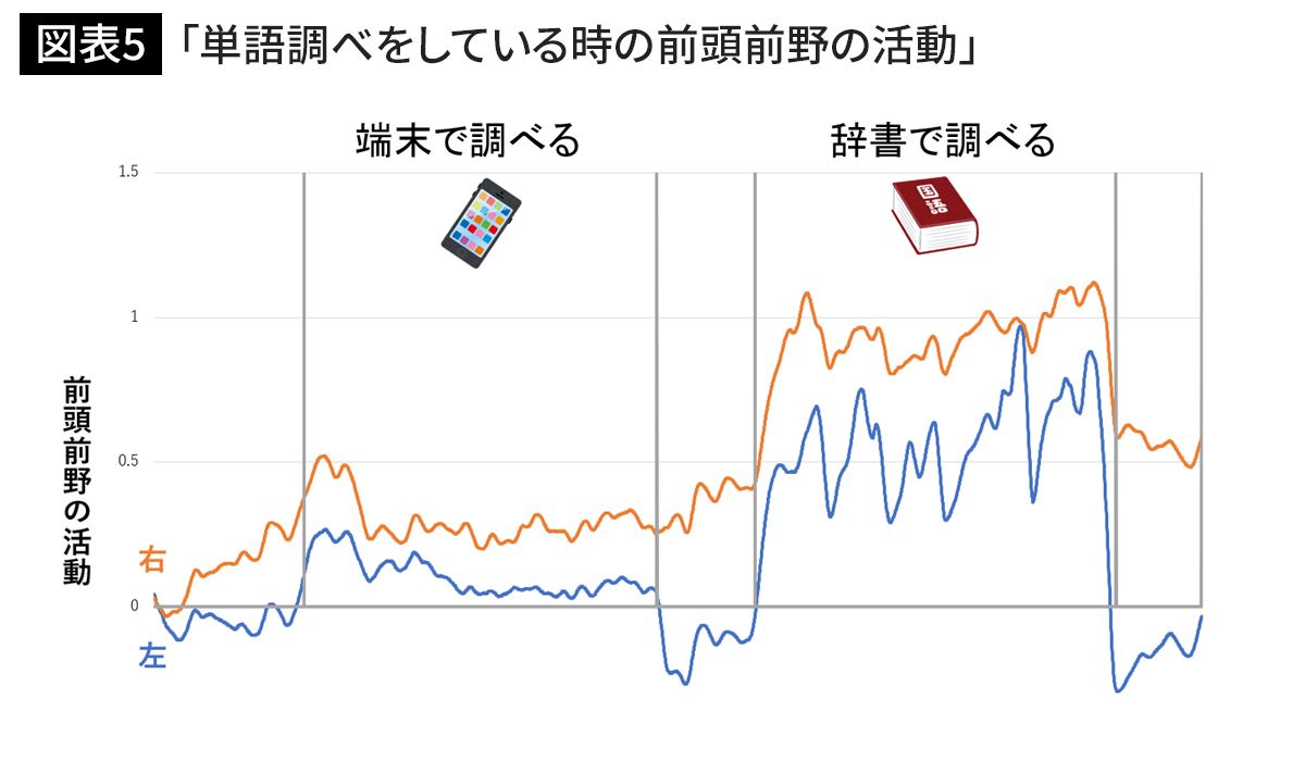 端末で調べたときには前頭前野はほとんど働かず、辞書で調べた時には活発に活動した。