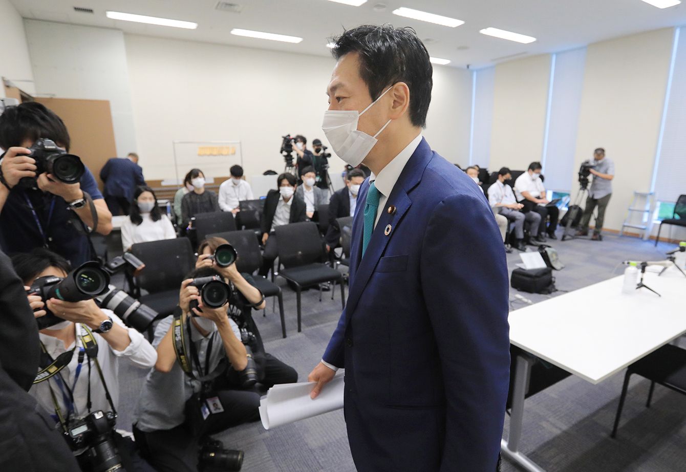 記者会見を終え、退室する衆院議員の秋元司被告=2021年9月9日、東京・永田町の衆院議員会館