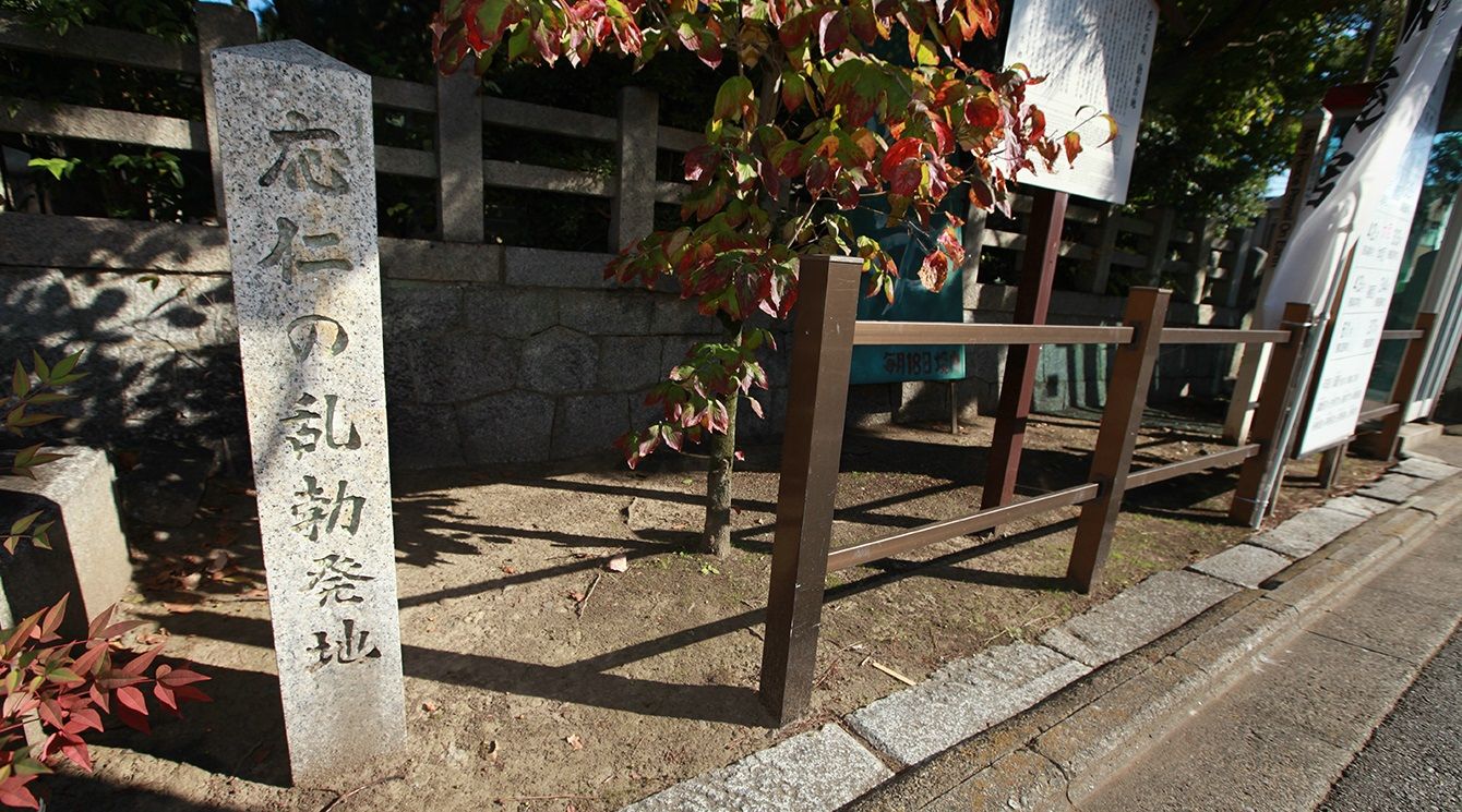 応仁の乱勃発地の碑=2014年10月30日、京都市上京区の御霊神社(写真=時事通信フォト)