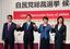 自民党総裁選候補者共同記者会見を前に、撮影に応じる(左から)河野太郎規制改革担当相、岸田文雄前政調会長、高市早苗前総務相、野田聖子幹事長代行=2021年9月17日、東京・永田町