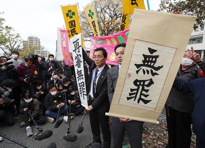 西山美香さんの再審判決で無罪が言い渡され、垂れ幕を掲げる弁護士=2020年3月31日、大津市