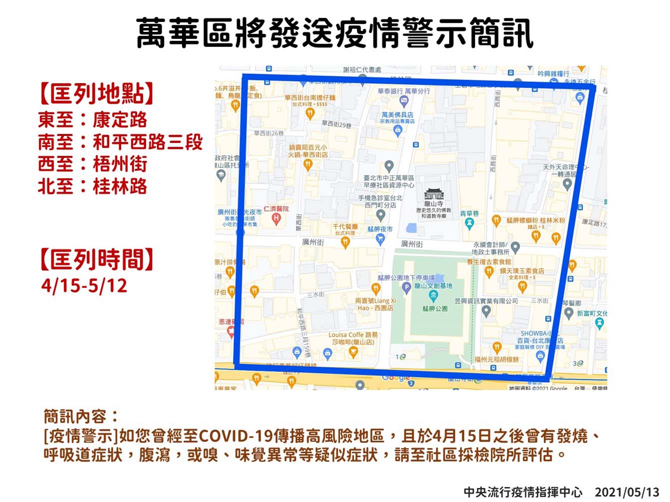 5月13日に公表されたクラスター発生区域の地図。(台湾・中央感染症指揮センターより)