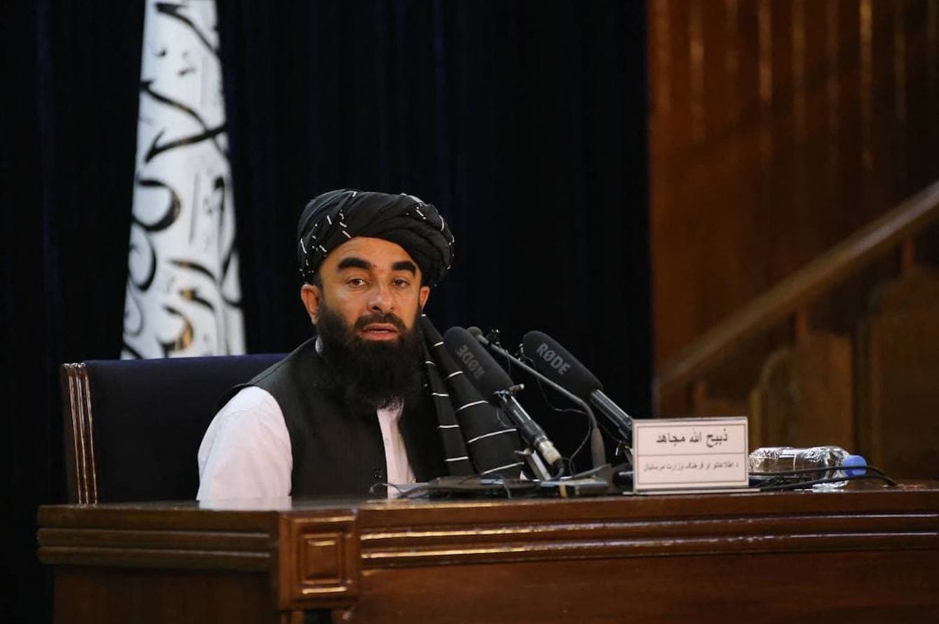 タリバンによる暫定政権発足にあたり、首都カブールで記者会見に臨むザビフラ・ムジャヒド報道担当(2021年9月21日)
